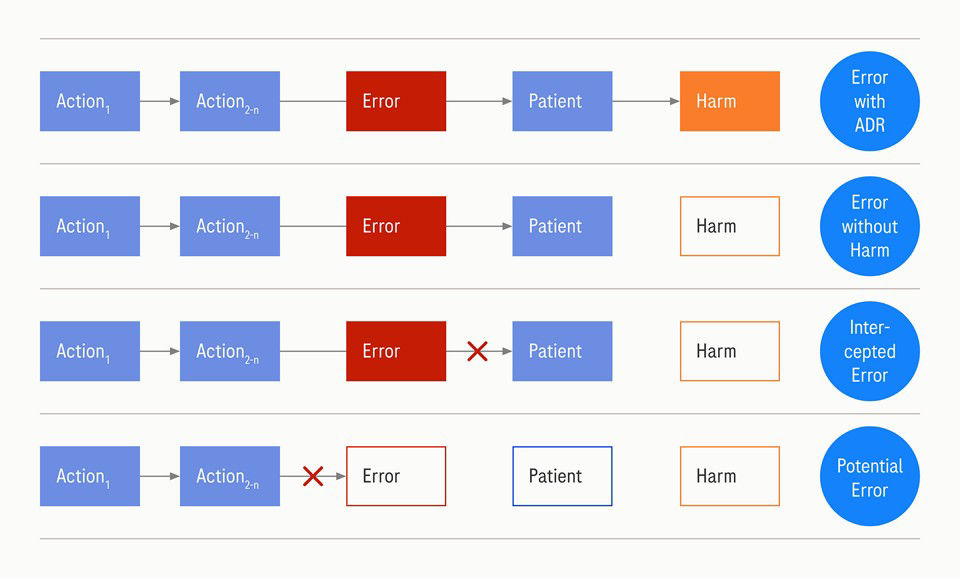 Wie in der Abbildung 4 dargestellt, können Medikationsfehler für die Zwecke der Pharmakovigilanz in vier Kategorien eingeteilt werden, je nach "Unterbrechung der Ereigniskette":1