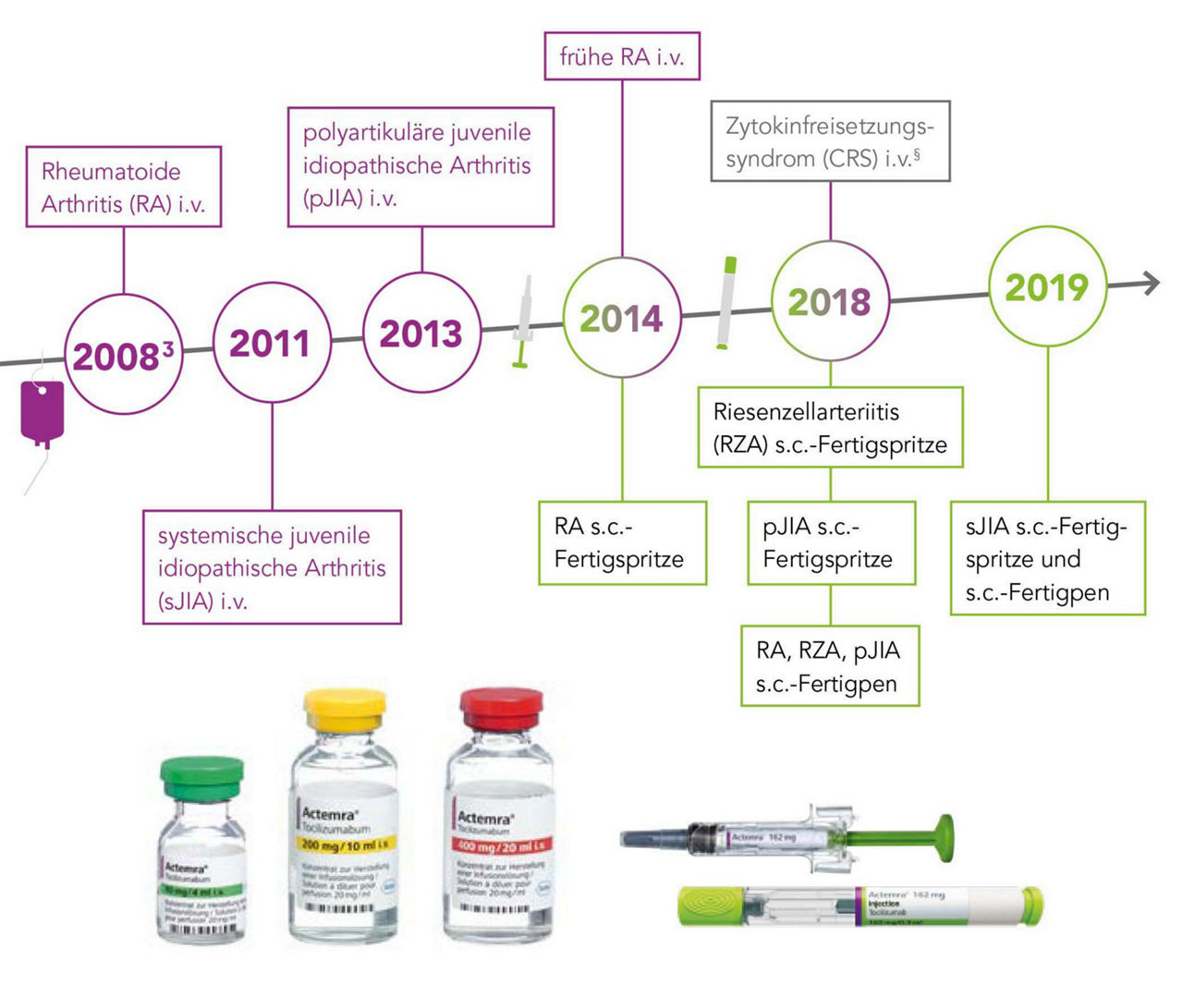 i.v. = intravenös; s.c. = subkutan RA = Rheumatoide Arthritis; RZA = Riesenzellenarteritiis; s/pJIA = systemische/polyartikuläre juvenile idiopatische Arthritis; CRS = Zytokinfreisetzungssyndrom